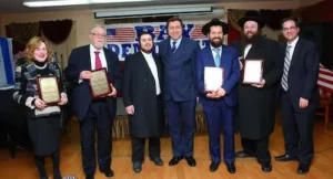 Honorees displaying their awards (L-R) Rebbetzin Pearl Burg, Rabbi Melvin I. Burg, Democratic District Leader David Schwartz, Democratic District Leader Ari Kagan, Rabbi Benzion Laskin, Alexander Rapaport, Councilman Kalman Yeger. Photo by Alex Rozenberg