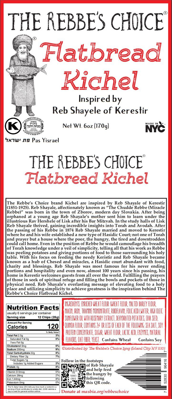 The label on the kichel includes an appeal to follow in the footsteps of Reb Shayele and help feed the needy by donating to the Masbia Soup Kitchen Network via this dedicated webpage: www.masbia.org/rebbeschoice.