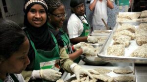 Courtesy of Masbia: Young volunteers from GLobal Kids helping the Masbia chefs cook fish for the Nine Days.