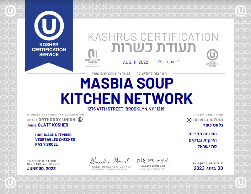 Post on: February 23, 2022Masbia is the only kosher-certified soup kitchen in America that is open to the public daily. Not only are daily dinners certified by the Orthodox Union (OU), the world’s largest and most widely recognized kosher certification agency, but everything we give out at our food pantry is certified by them as well. Since we receive a lot of donated food items and federal commodities which don’t have a hashgacha (aka kashrut symbol) on the packaging, we found it necessary to have a blanket certification of our entire inventory of emergency food. Not only do we try to give our people the best food with the utmost dignity, but we also give them a high standard of kashrut, thus the OU is our certifying agency. (Some of our facilities might have an additional local certification based on what is popular in that neighborhood). All hot food served in our restaurant-style soup kitchen is glatt kosher, done with hashgacha temidis, uses vegetables that have been checked for bugs, and is pas Yisroel.
