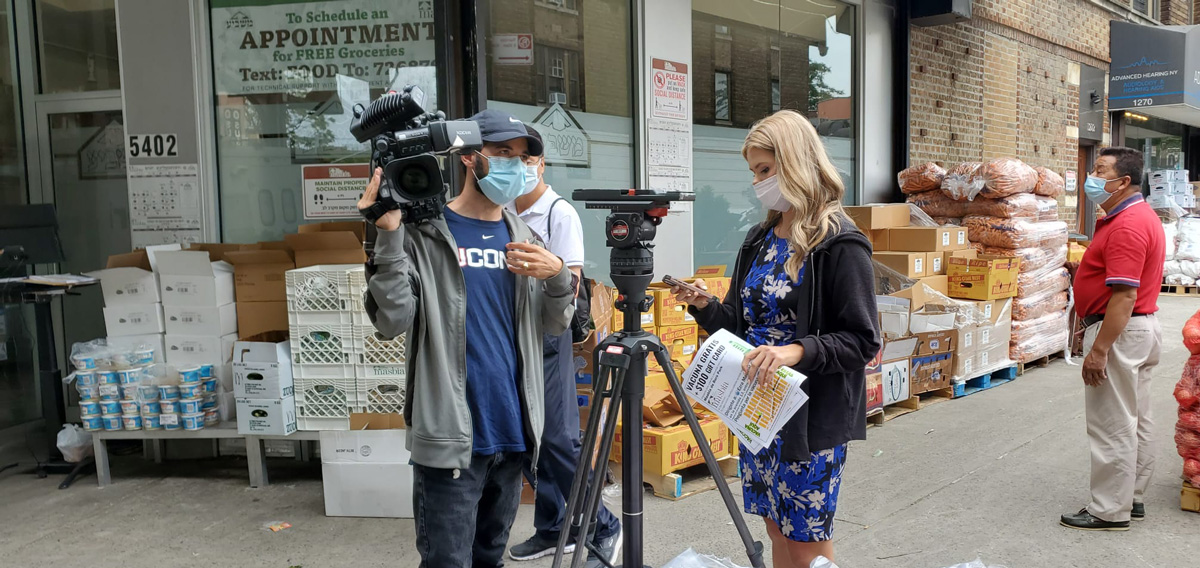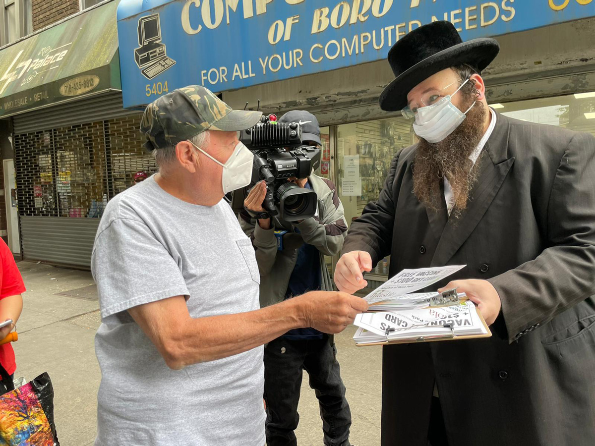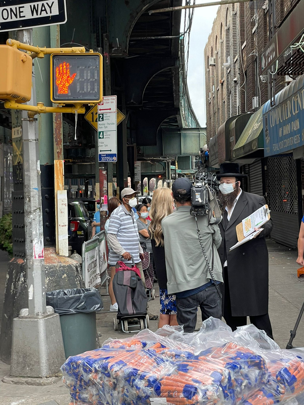 The anchor of News12 presents reporter Faith Graham at Masbia of Boro Park interviewing our ED AlexRapaport about Masbia Soup Kitchen Network starting to encourage thousands of immigrant families who come to pick up their weekly emergency food packages to get vaccinated and the $100.00 gift card.