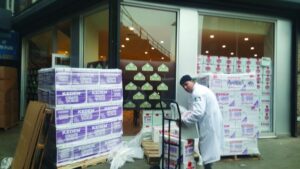 Masbia’s warehouse in Borough Park receiving 1,000 pounds of Matzah for Passover. Courtesy of Masbia